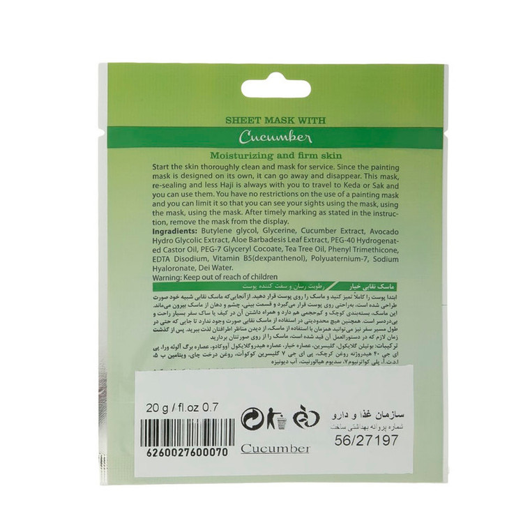 دیدن محصولات مرتبطماسک صورت نقابی مدل خیار دارای خواص رطوبت رسانی و ضد چین و چروک و سفت کنندگی پوست می باشد همچنین این ماسک دارای ویتامین ای, ویتامین آ و ویتامین بی می باشد.